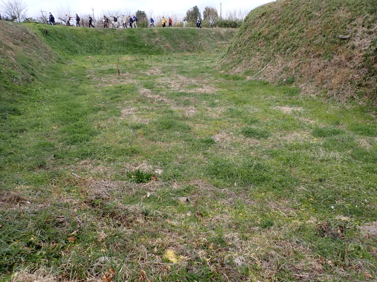 高さは人の大きさからみると5mぐらいの深さ(戦国当時は7mぐらいあったように思います)ですので空堀から上にあがれません。さらに、上の両側と正面(人がみえるところ)から矢と鉄砲玉でとんできてます。