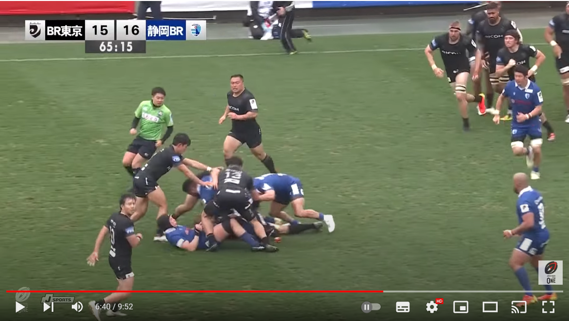 密集(モールとラック)はラグビーで一番難しいと言えるところですので、上の説明を何度も読んで理解した上で、6:37~6:44の動画を0.5倍再生で何度もみてください。