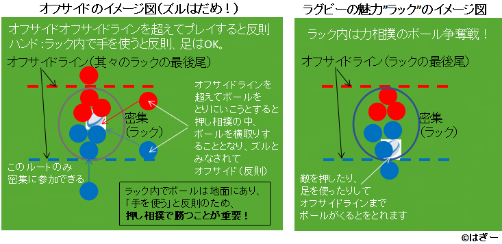 ラックができる両チームの最後尾にオフサイドラインがあり、それを超えてプレーするとオフサイドという反則になります。オフサイドラインはサッカーと違い、ラグビーは自陣側にできます。