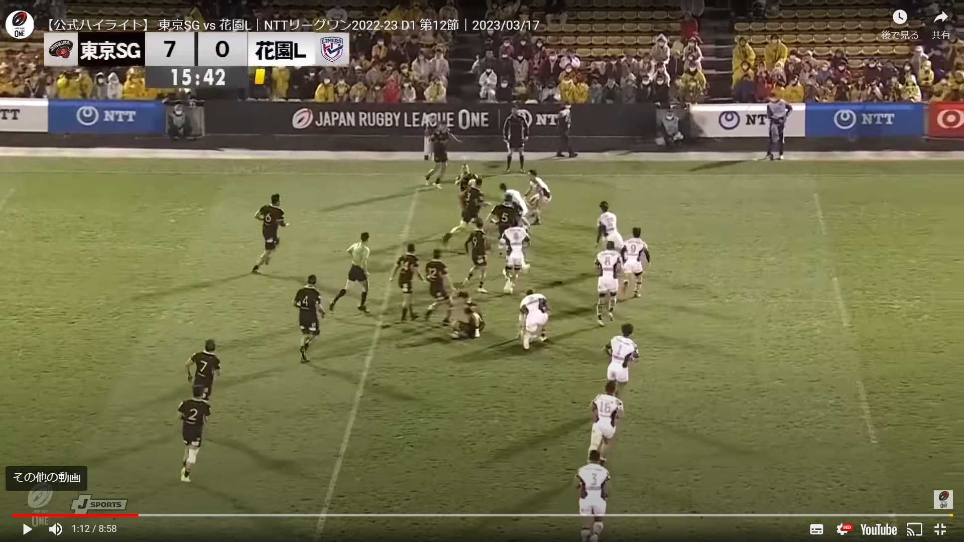 黒10番のアーロン・クルーデンはNZ代表オールブラックス50CAPをもつ世界を代表するスーパースターで、神戸スティーラーズに2020~2022年在籍し、今期からサンゴリアスに移籍してきています。通常倍速で1:01~1:30をみてください。