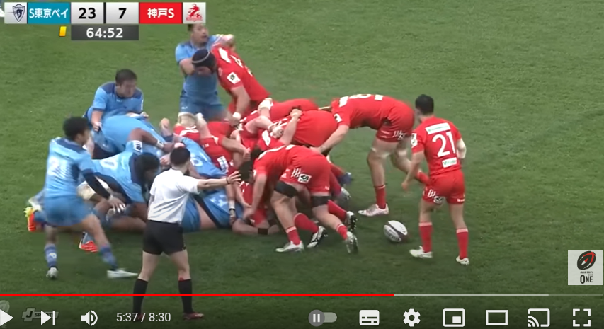 動画に戻ると、青はコラプシング(Collapsing)という「スクラムやモールを故意に崩す反則」をしたため(下写真)、赤はボールを出せる有利な状態のため、5:37にレフリーはアドバンテージを宣言と同時にアドバンテージがあるチームの方に手を横に伸ばし(下写真)、試合継続させます。もし。ボールがでそうにない場合は、反則で試合ストップです。