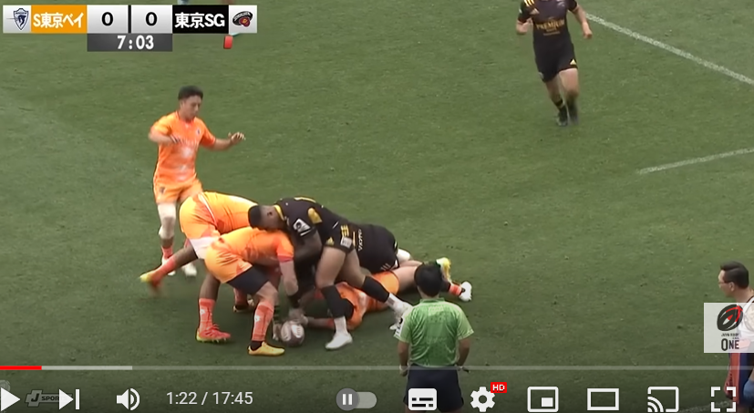 次のクリック後、すぐに停止・0.5倍再生に変更して、テビタ・リー選手のタックル後の陣取りをよく確認してください。