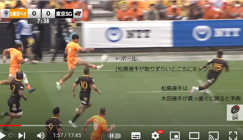 これは普通であれば(11番がここまで守備に来ていないので)、スピアーズは木田選手のキックボールをとってトライしていたと思います。
