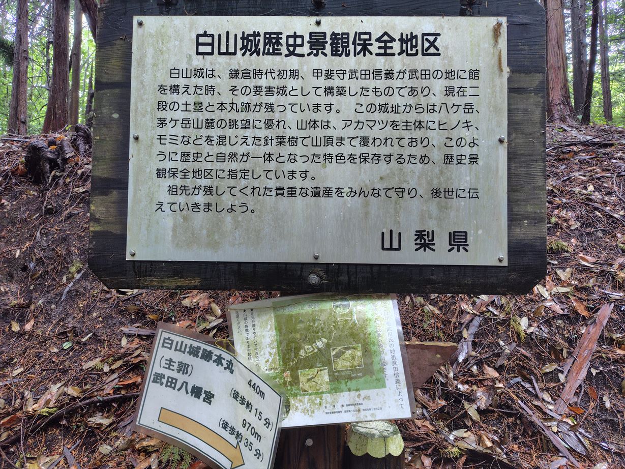甲斐源氏の祖・源清光の子である武田信義が要害として築城したと伝わっています。旧武田領を巡って北条氏と徳川氏が争った天正壬午の乱では、白山城には武田遺臣の一部の青木氏・山寺氏が徳川家康に臣従し配置されました。
