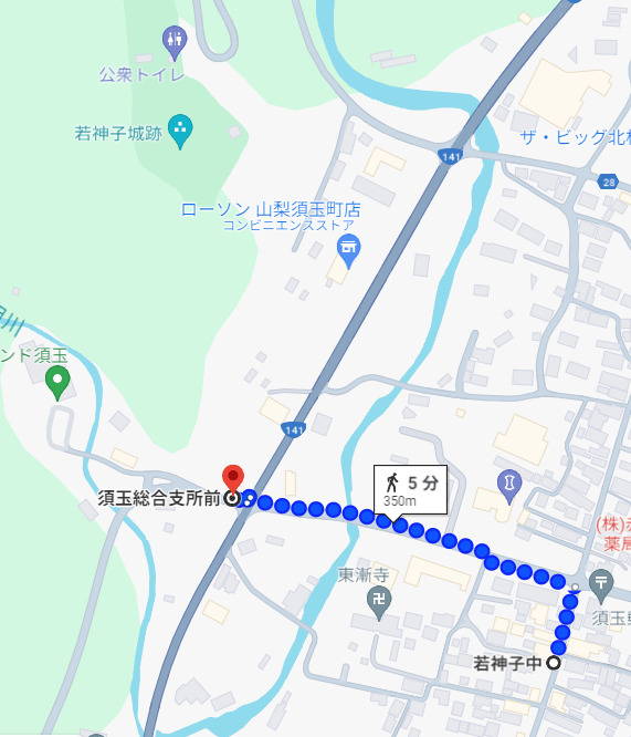 ①韮崎駅から増冨温泉行のバスで「若神子中」バス停で下車