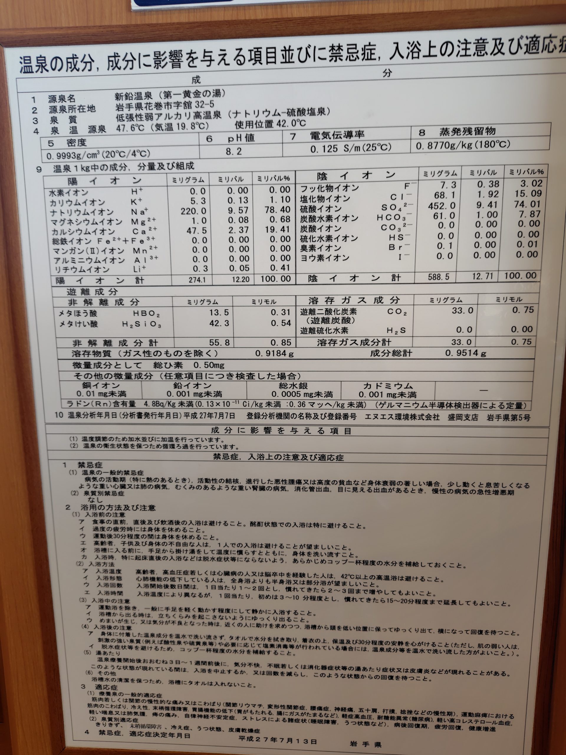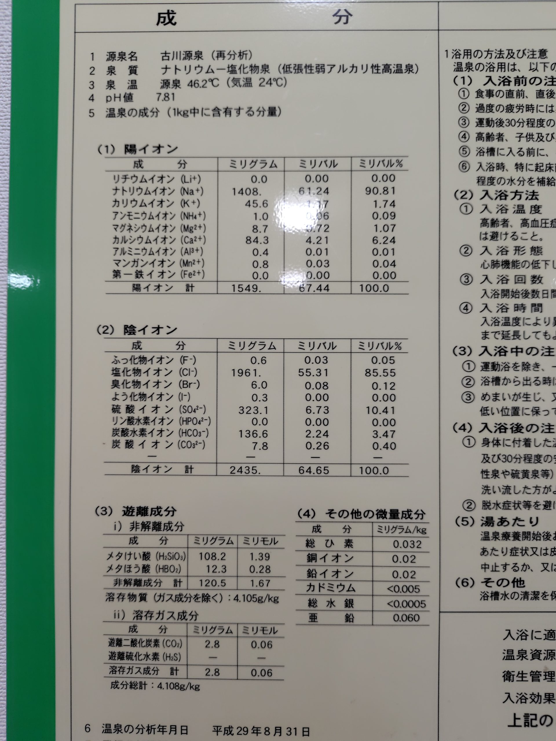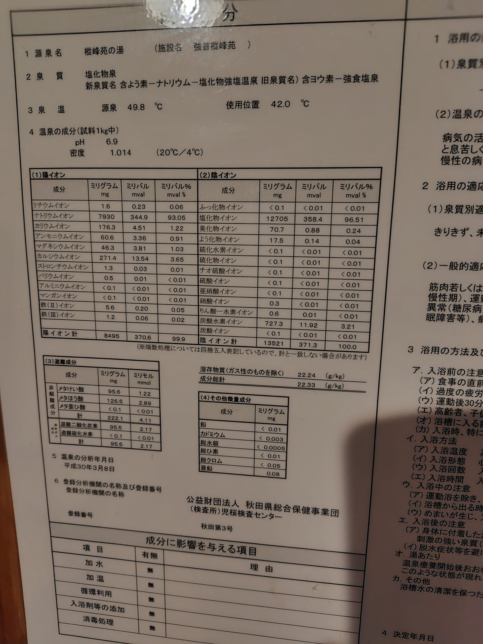 内風呂の源泉分析書