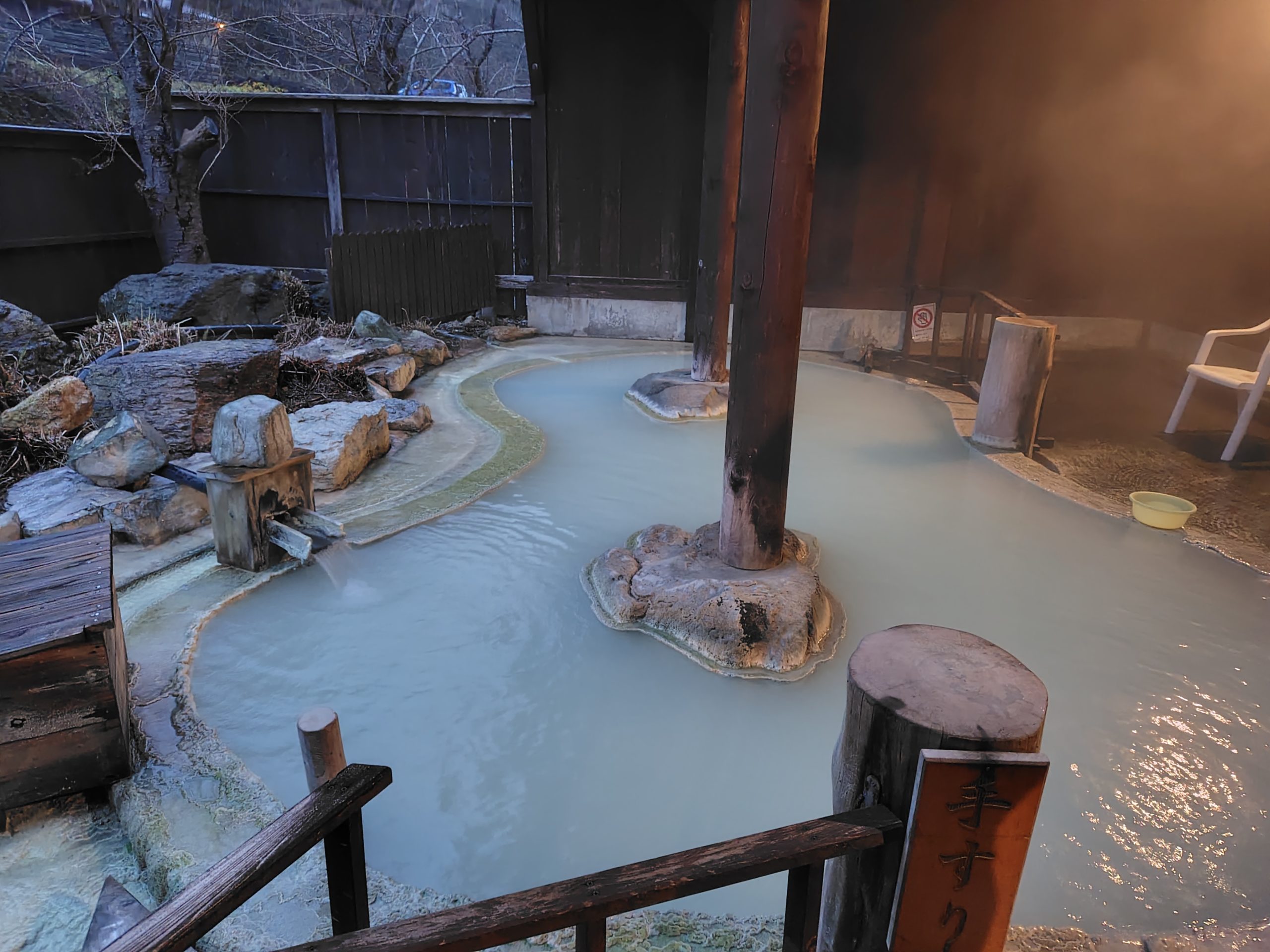 露天風呂ではまた別の源泉。ここは泉質が2つ!白濁で成分の濃厚!
