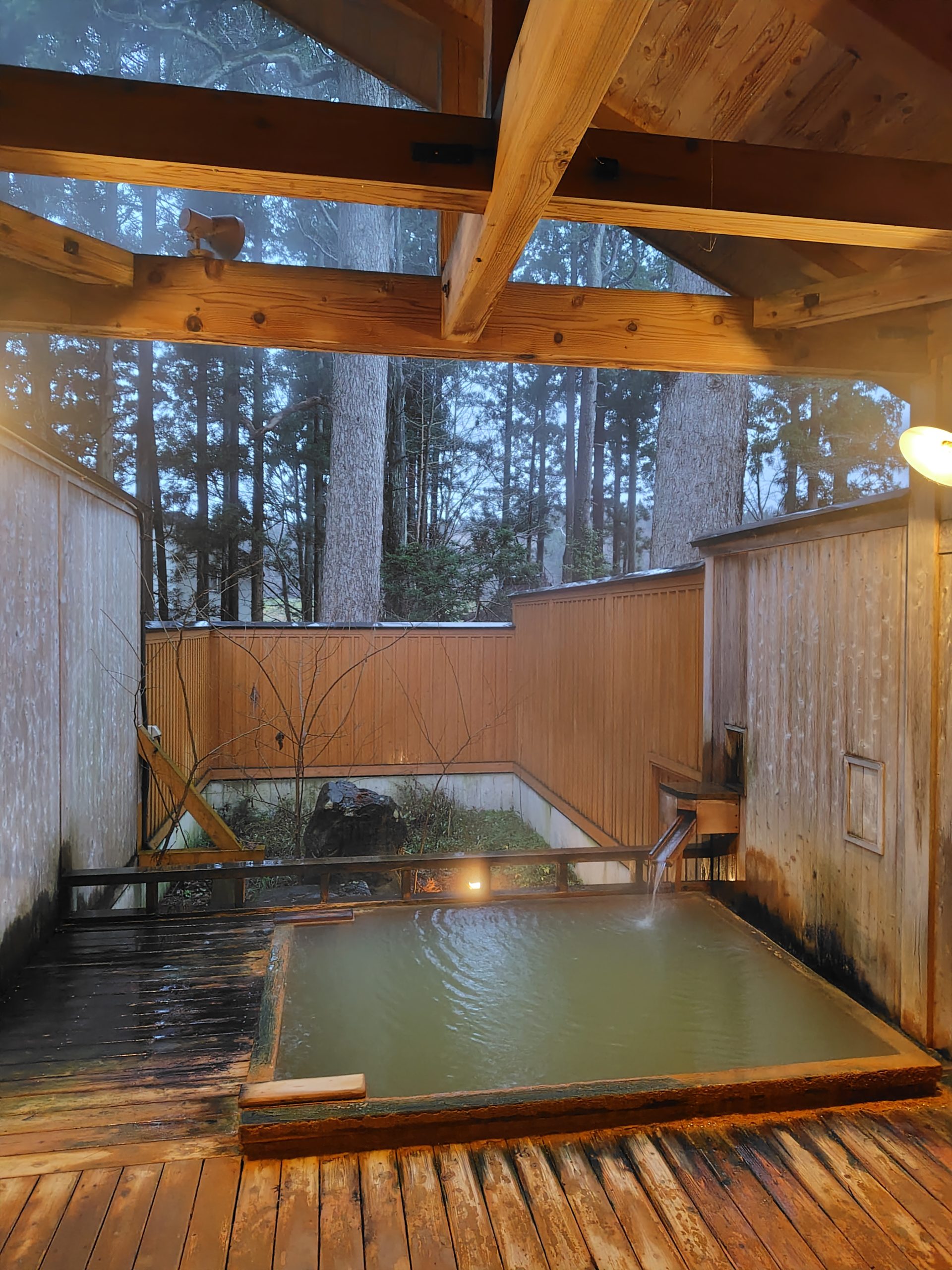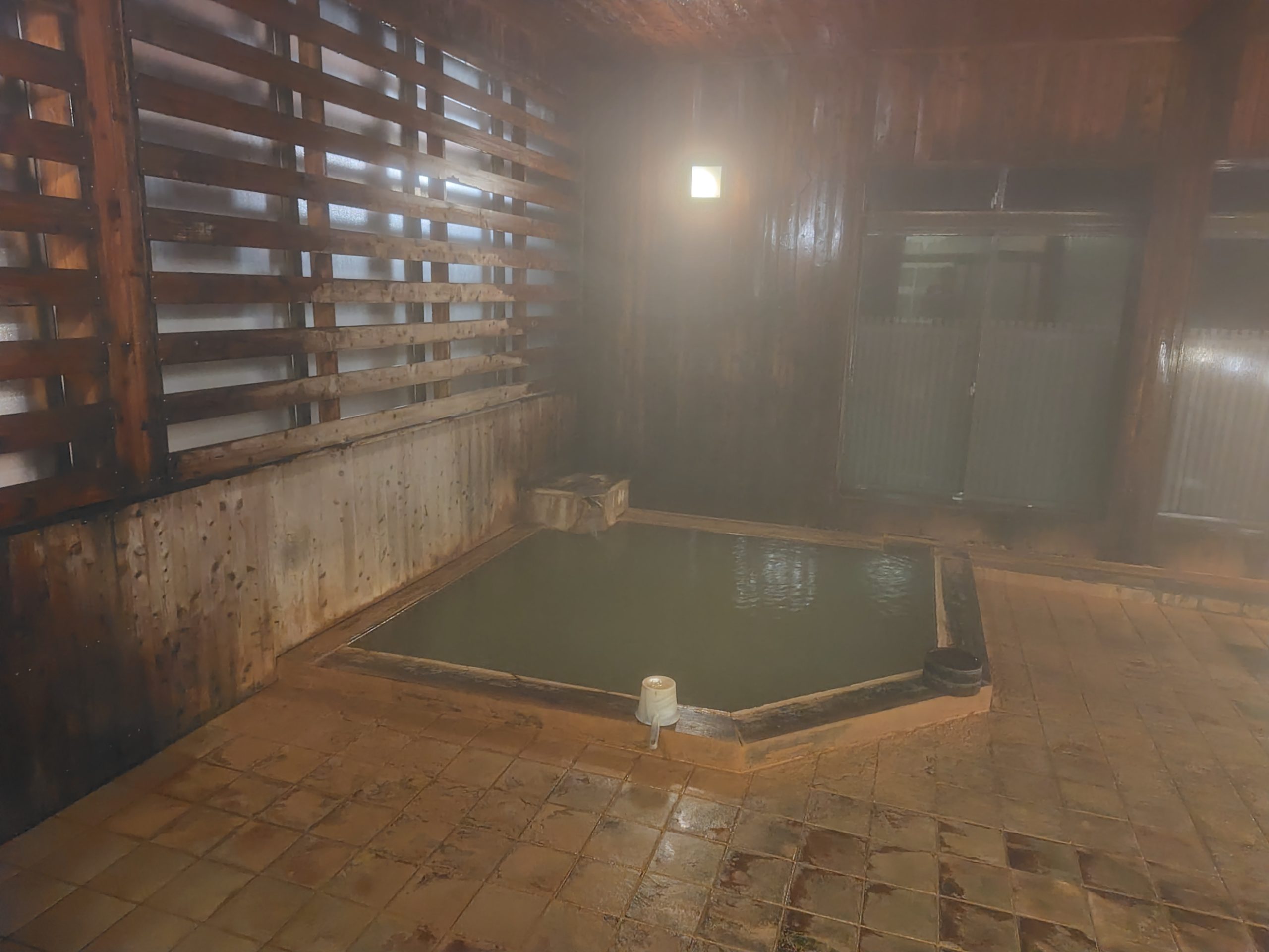 加水・加温・循環ろ過で残念。ただ一人はいれるくらいの陶器風呂があり、そこは加温なし100%源泉かけ流しでした。泉温68.6℃で加水なしなのでとてもアツい。仕方なく水を混ぜました笑