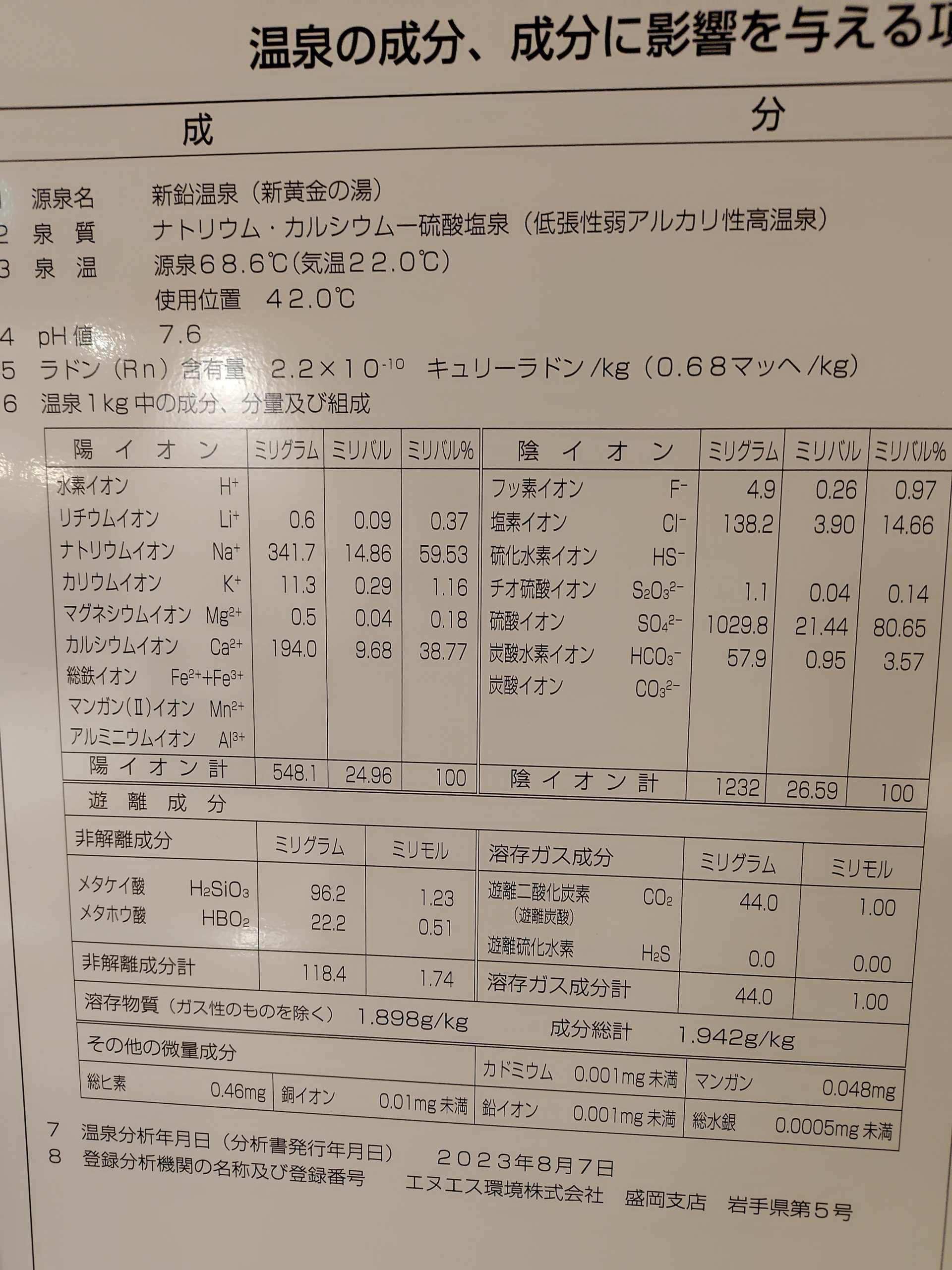 源泉分析書(貸切風呂・内風呂ともに同じ源泉)
