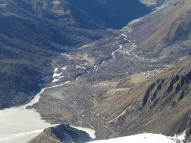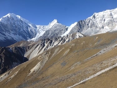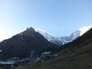 中央のピークがランタン・リルン7225mで、一番手前の雪がない小ピークはキャンジン・リ4550mでツアーでいくピークです。