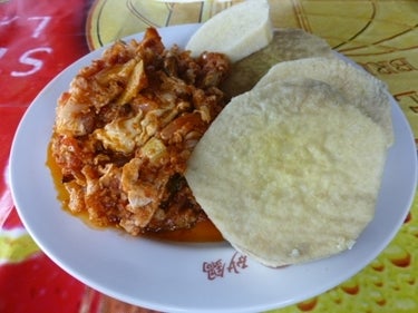 下写真の丸いものは、芋のおもちです。味はなく、となりのソースをつけて食べます。