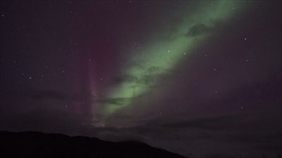 写真中央の右上の北斗七星がわかるでしょうか? 目にみえなくても明るいレンズで20秒ぐらいのシャッタースピードで撮影すると次のようなオーロラが見れたりします。