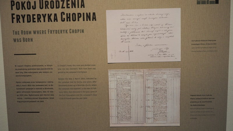 ショパンの生家は残念ながら消失してしまいましたが、家具や内装はショパンの生まれた当時のままに復元され、出生証明書、洗礼証明書、両親の婚姻届の複写、初めて書いた楽譜の複製など数々の貴重の品を展示しています。
