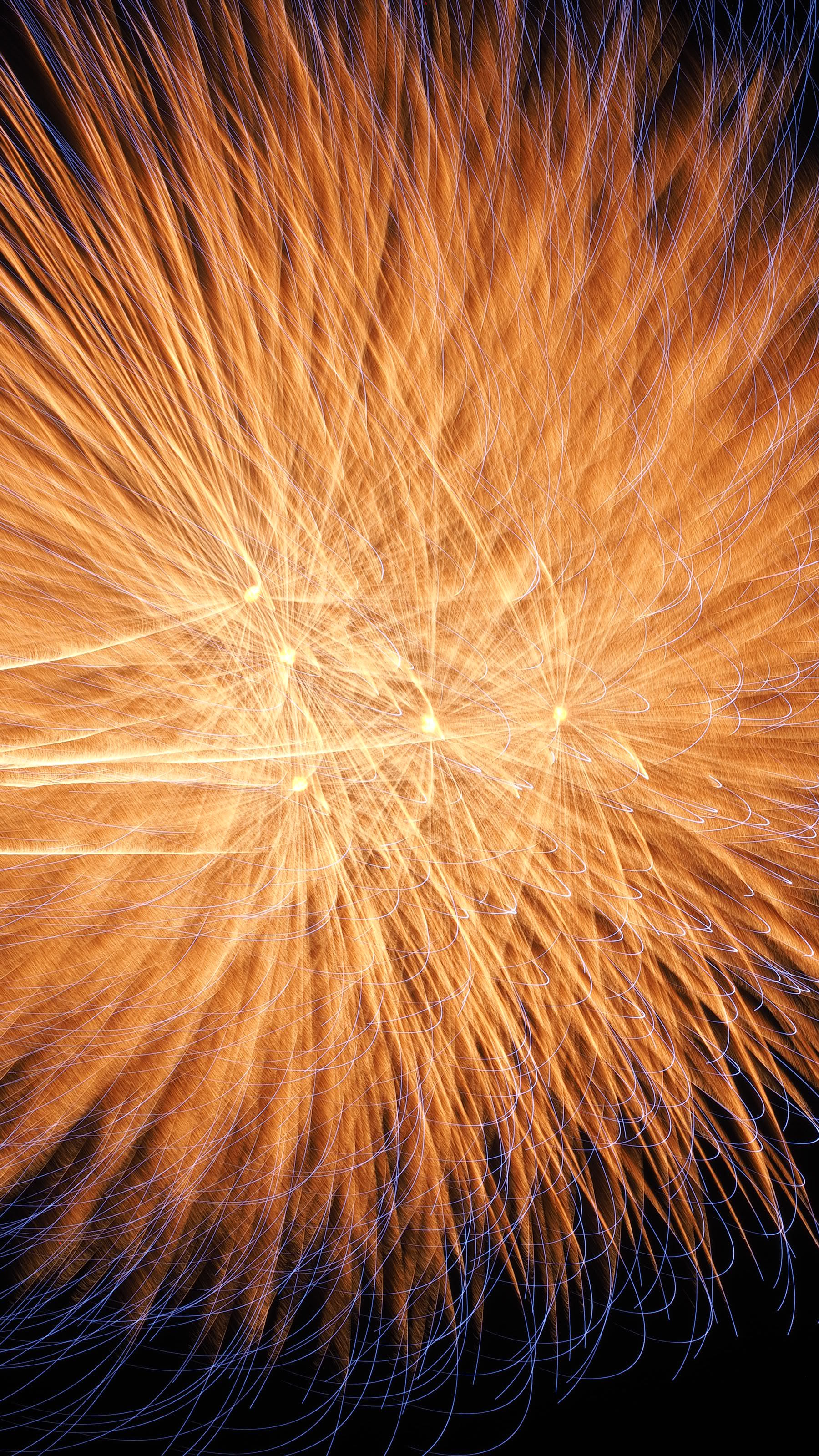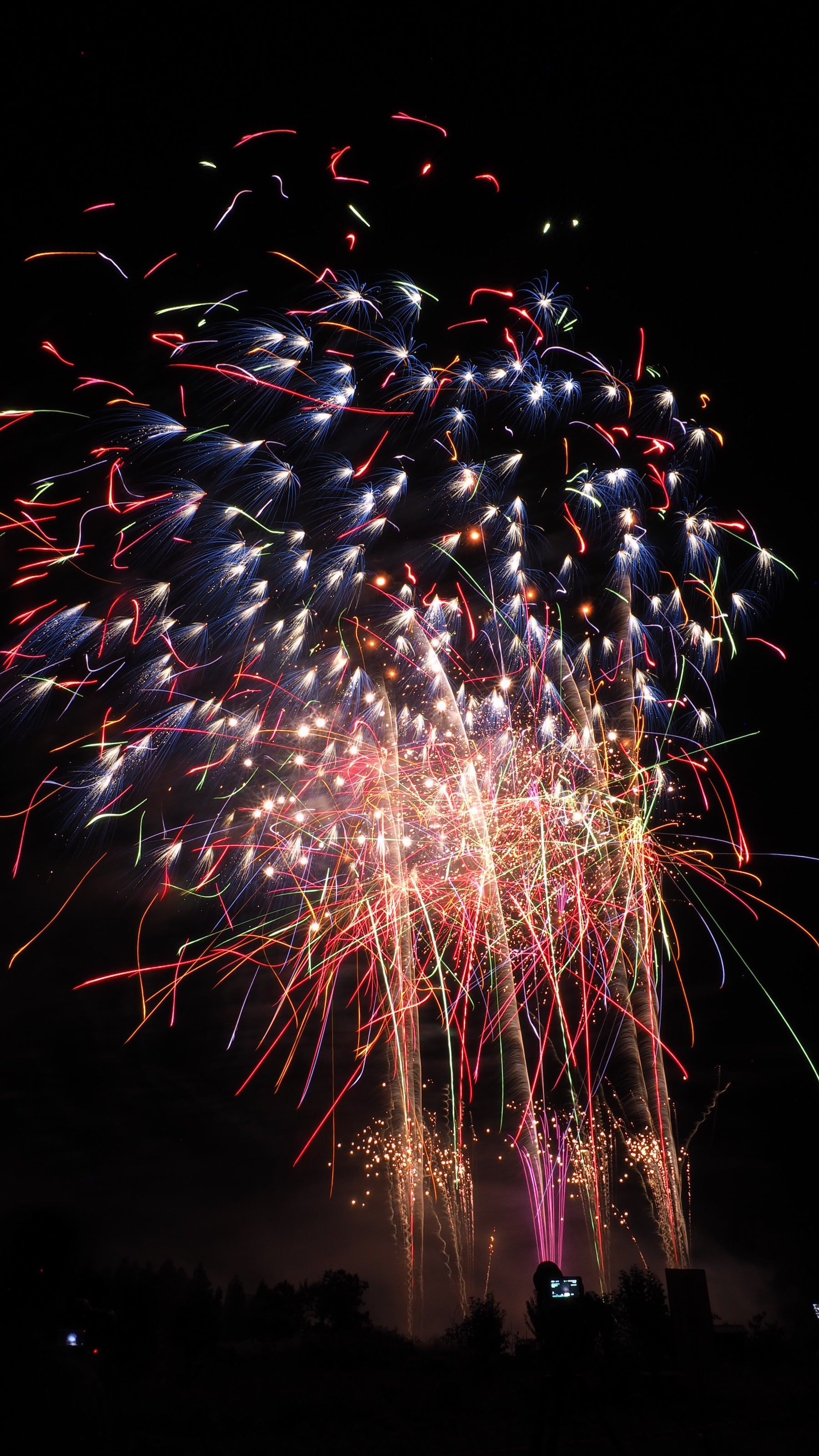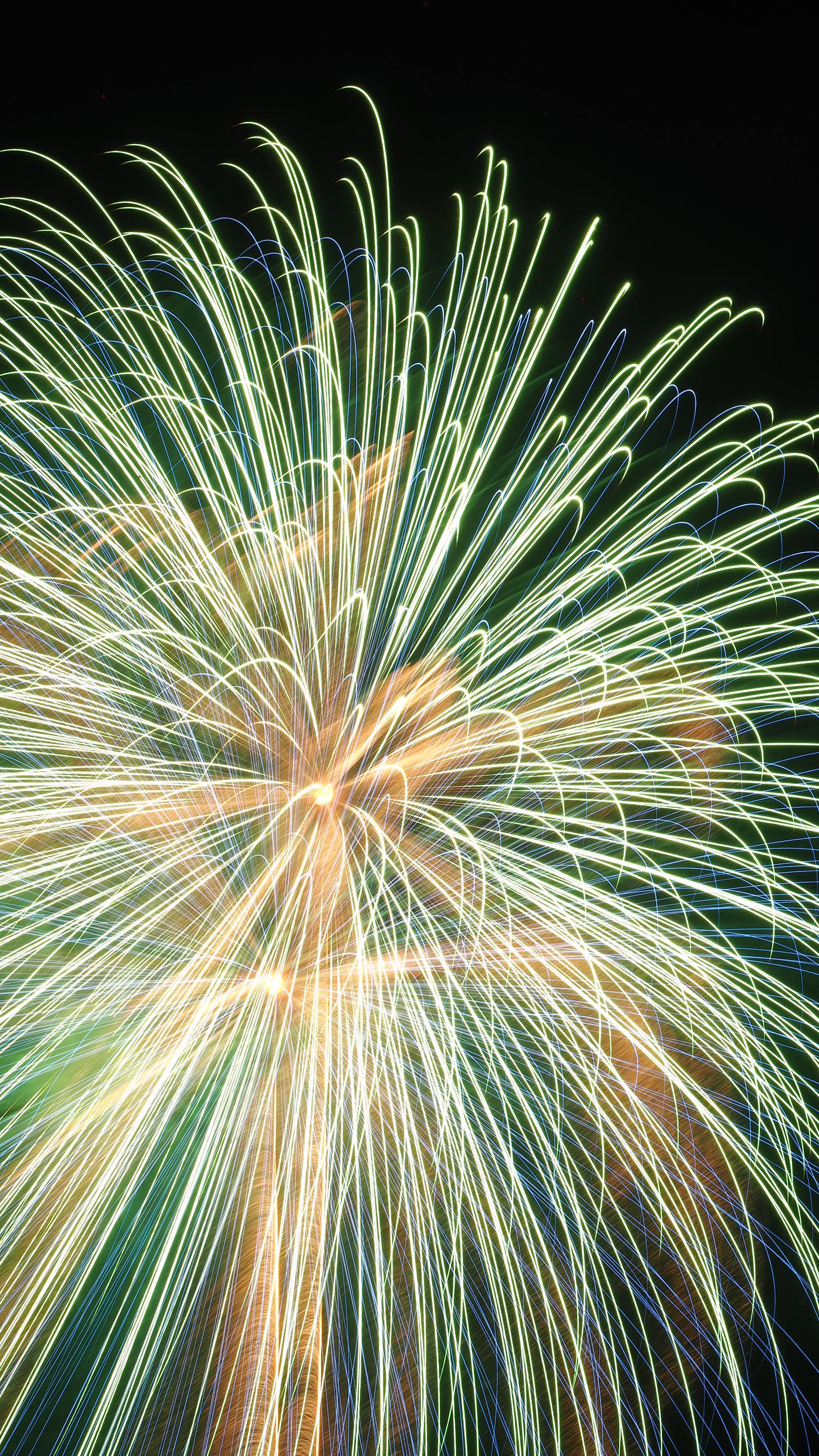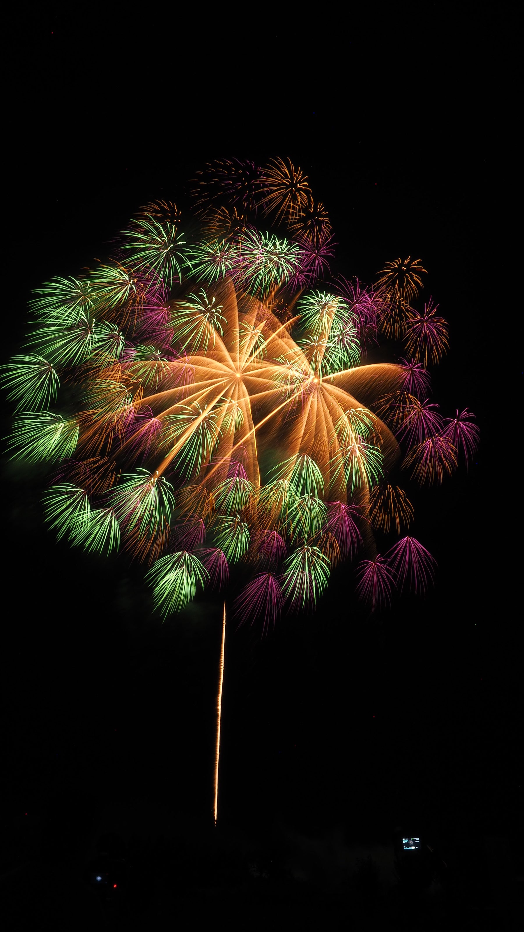 四尺玉は私たちがよく見る花火(4号)と比較すると、玉の外径10倍(114cm)、重さ75倍(400kg)、上がる高さ3.5倍(575m)、開いた直径6倍(675m)と巨大で、さすが世界一、迫力がズバ抜けてます!