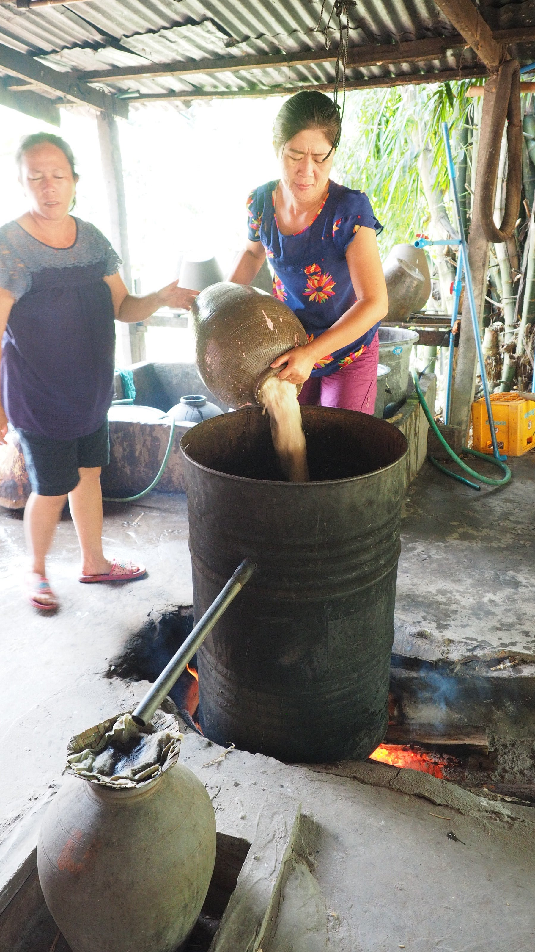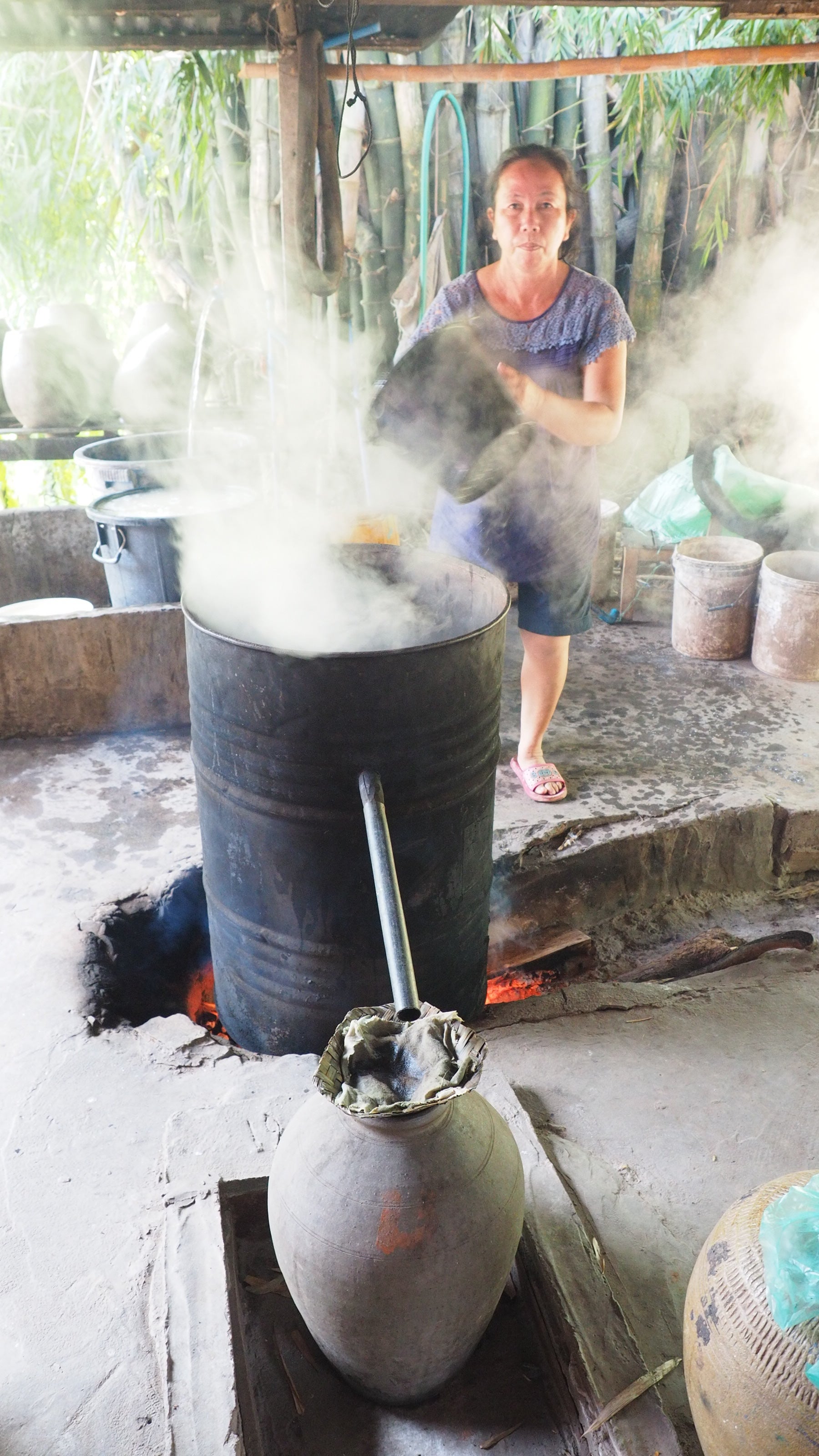 発酵させたお米にお水を加え、2時間沸騰させながら、お湯を取り出し、最終的に20Lの焼酎ができるようです。