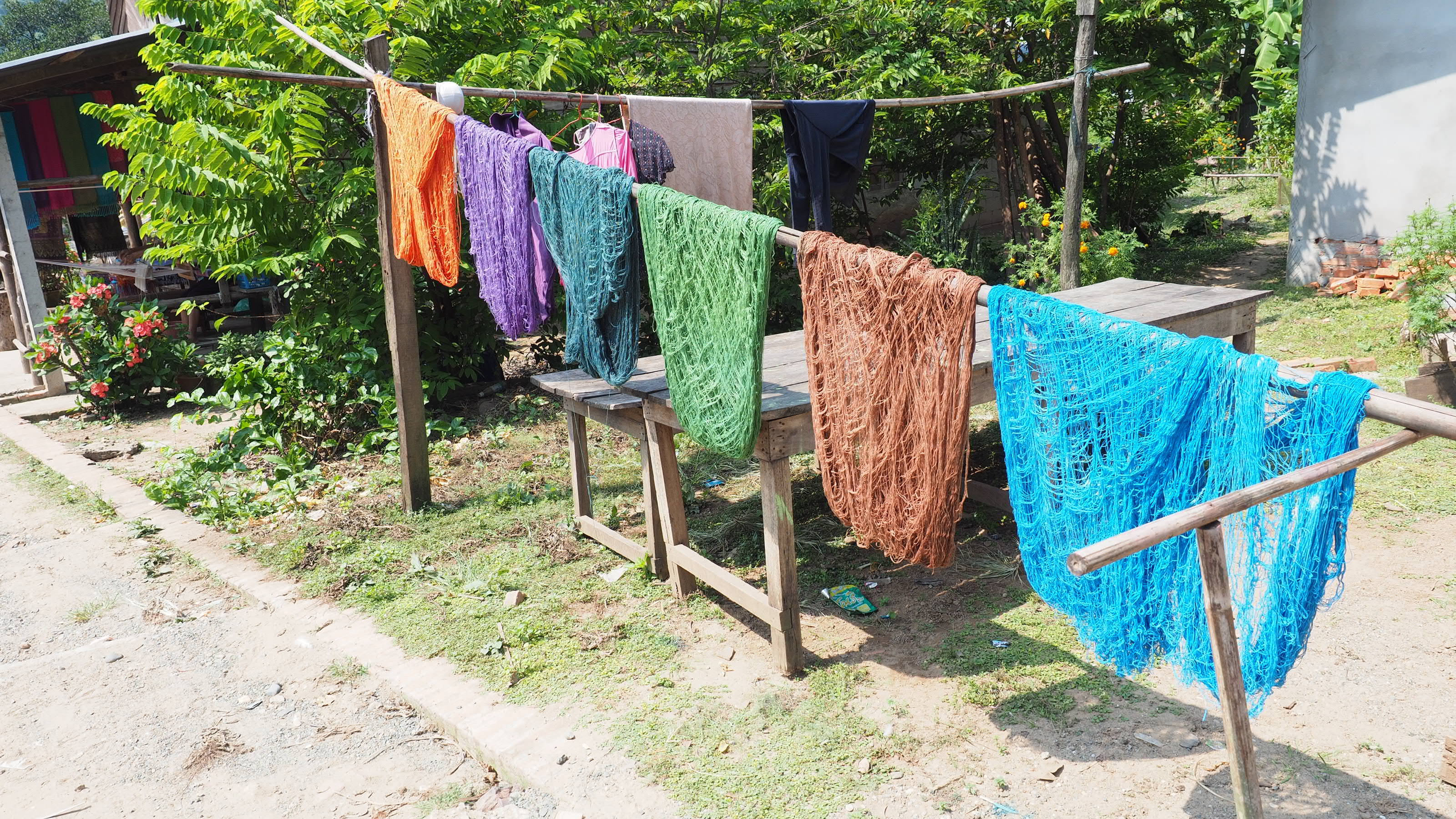 ここは織物も作られ、糸を染色して乾かしてました。