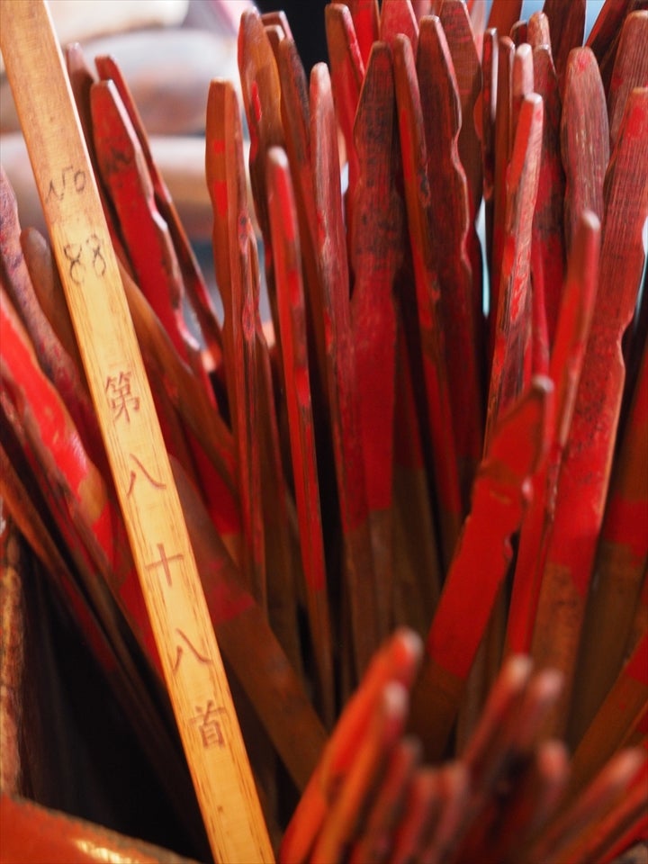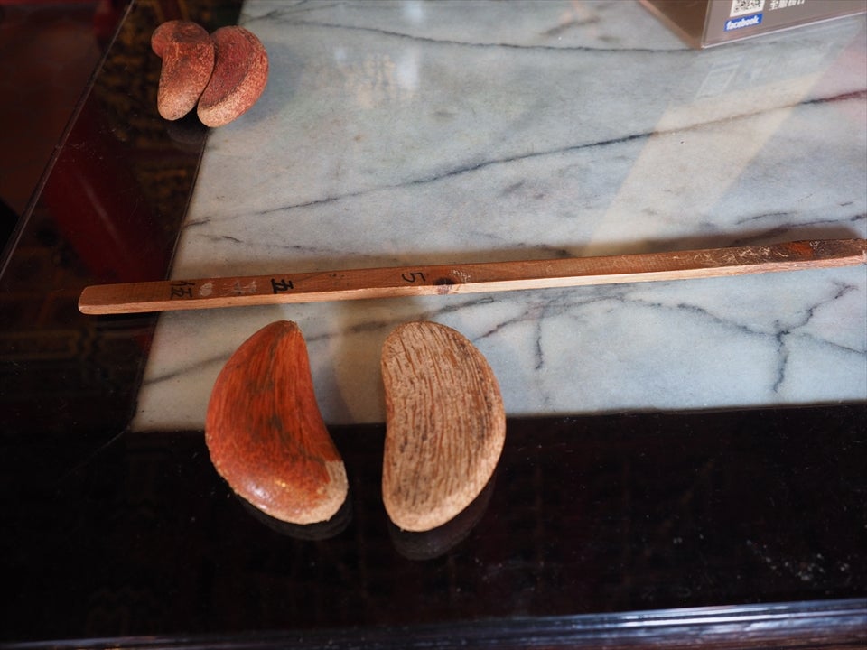 次の2つの木をもって、落として、裏表だったら、そのおみくじになって、表表または裏裏ならもう一度おみくじを引いてまた木を落としてと繰り返します。