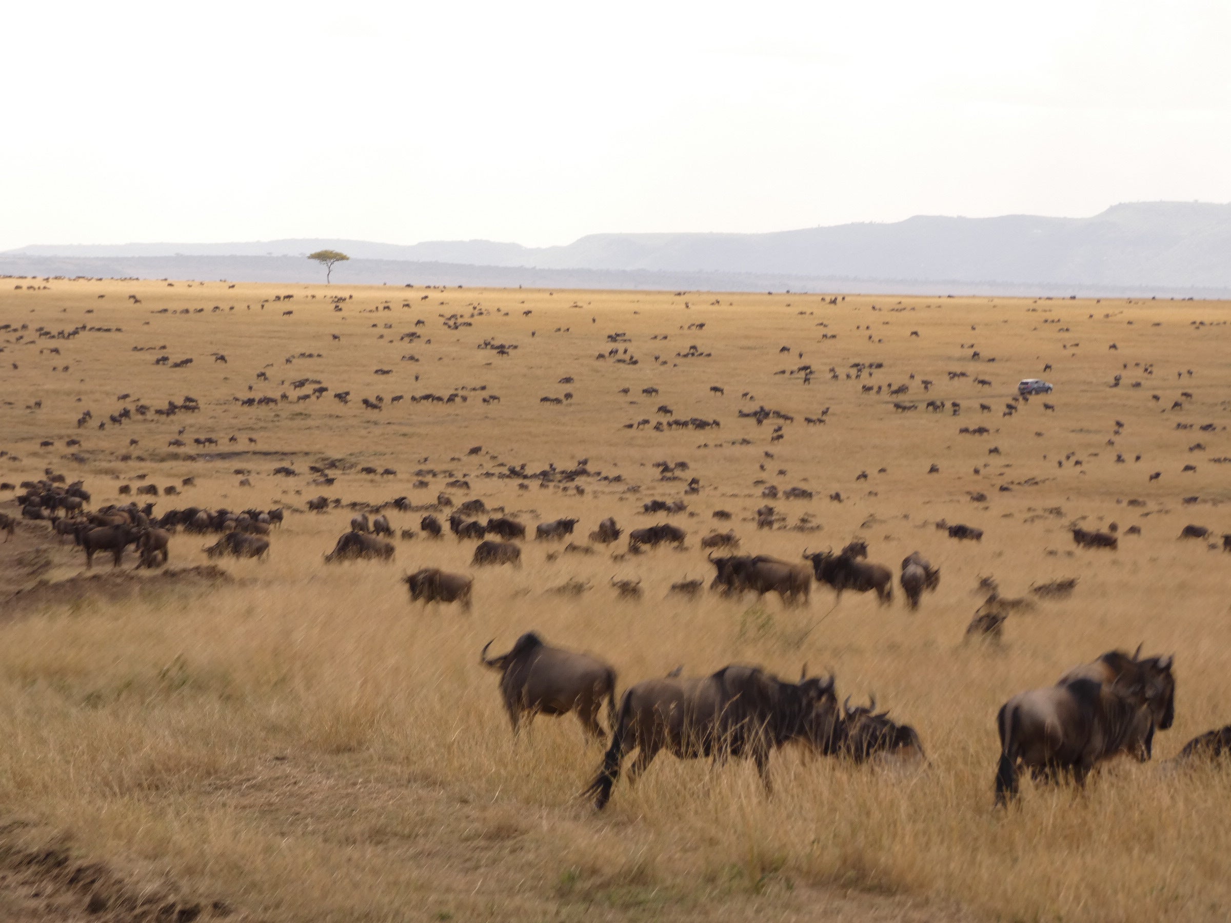 サファリ・ドライブ(ヌーの川渡り、ヌーの大群、チーター、ライオン、象、キリンなど)